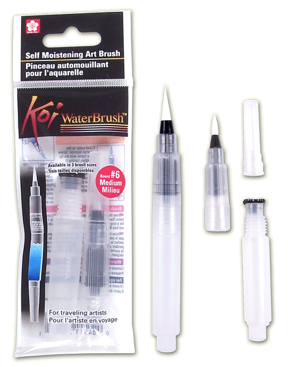 For the artist on the move, simpler the better. The portable and collapsible Koi Waterbrushes are the unique tool that puts a water reservoir at your fingertips. The self contained water reservoir inside the handle delivers water conveniently and directly to the brush tip. The fine flexible nylon brush tip provides excellent watercolor dilution and can produce fine lines or bold broad strokes. The lightweight transparent barrel signals when refilling is needed. Available in three round brush sizes: Small (#2 round), Medium (#6 round), Large (#8 round) Packaged individually in re-sealable, hanging pouches.