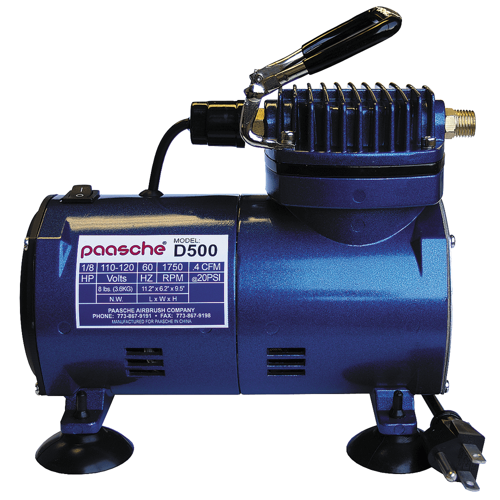 The D500SR airbrush compressor is perfect for any hobby or artist airbrush. The maximum operating pressure will be about 35 PSI depending on airbrush being used. The D500SR is light weight, easily mobile and best of all quiet. The auto shutoff feature turn the compressor off when the airbrush is not being triggered to increase compressor life. Included with the compressor is a 1/8BPS adaptor for competitor hoses.